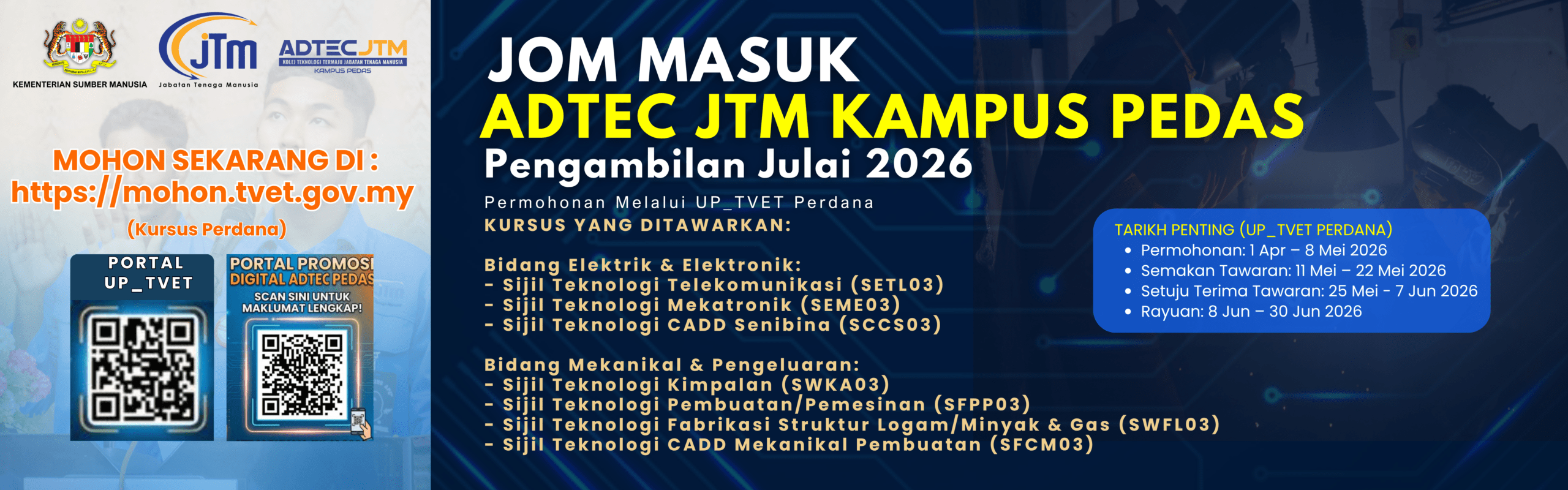 ADTEC JTM Kampus Pedas ingin menarik perhatian orang ramai berhubung kewujudan cubaan penipuan oleh pihak tidak bertanggungjawab yang telah menggunakan nama Institut Latihan Perindustrian Pedas atau pegawai institut ini bagi urusan penawaran.